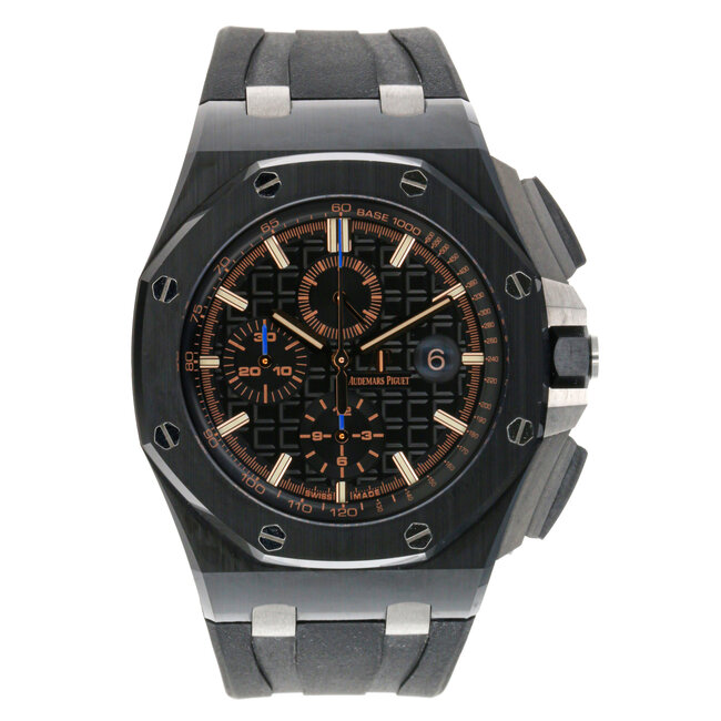 44 mm black ceramic case, 14.4 mm thick, screw-locked crown and pushpieces with titanium pushpiece guards, black ceramic bezel, glareproofed sapphire crystal, black dial with Méga Tapisserie” pattern, black counters, pink gold applied hour-markers and Royal Oak hands with luminescent coating, black inner bezel, Calibre 3126 / 3840 Manufacture selfwinding movement with chronograph, hours, minutes, small seconds, date, approximately 50 hours of power reserve, black rubber strap, titanium pin buckle. Water resistant to 100 meters.