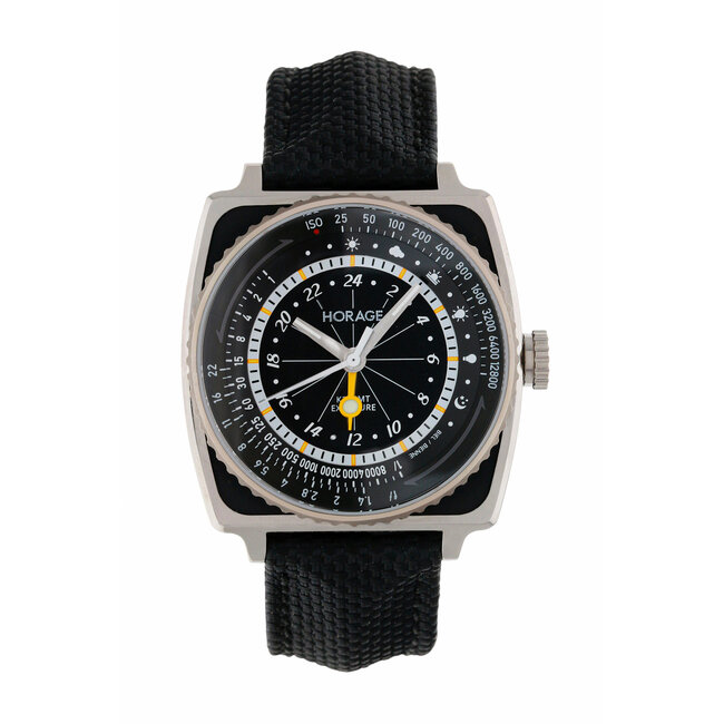 Dial / Black or Yellow options. 12 and 24-hour tracks, minutes/seconds track, light conditions via icons and shutter speed (to work with rotating bezel), central GMT hand