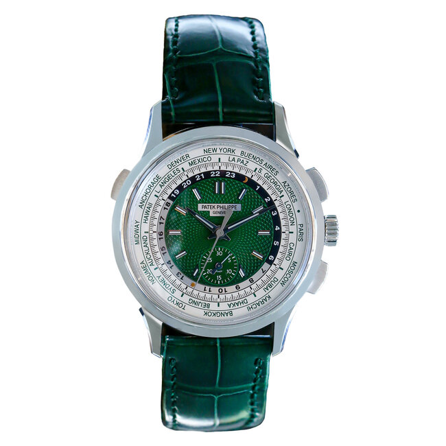 Dial: Emerald green dial – hand-applied circular guilloché pattern – two-tone white and black 24h ring – white chronograph seconds ring with black markings – green on white world timer city ring – applied gold hour indices – chronograph 30-minute counter at 6 o’clock