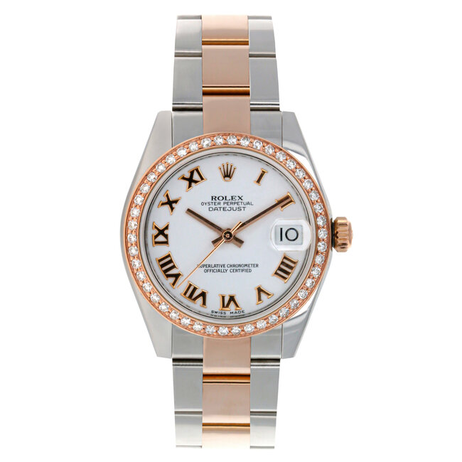 31mm Everose Rolesor case comprised of Oystersteel and 18K Everose gold, screw-down back, screw-down crown with twinlock double waterproofness system, 18K Everose gold fluted bezel, scratch-resistant sapphire crystal with cyclops lens over the date, white dial, Roman numerals, Rolex calibre 2236 perpetual self-winding movement with date at 3 o'clock, approximately 55 hours of power reserve, Eversose Rolesor Oyster bracelet made from a combination of steel and 18K everose gold with flat three-piece links, folding Oysterclasp buckle with Easylink 5mm comfort extension link. Waterproof to 100 meters.