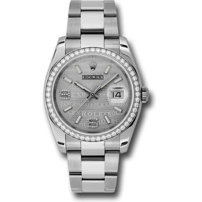 36mm stainless steel case, 18K white gold bezel set with 52 brilliant-cut diamonds, silver wave dial, diamond set 6 and 9 Arabic numerals, and stainless steel Oyster bracelet.
