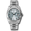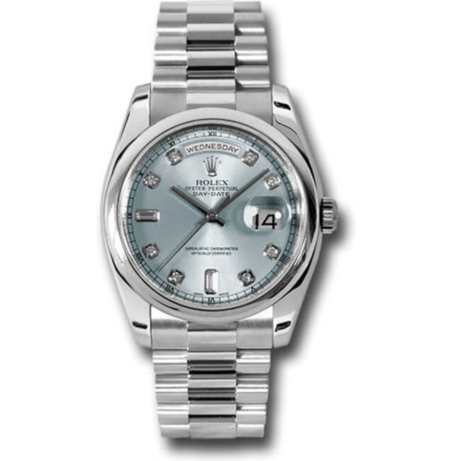 The Rolex President. 36mm platinum case, domed bezel, glacier blue dial, 8 round and 2 baguette diamond hour markers, and President bracelet.