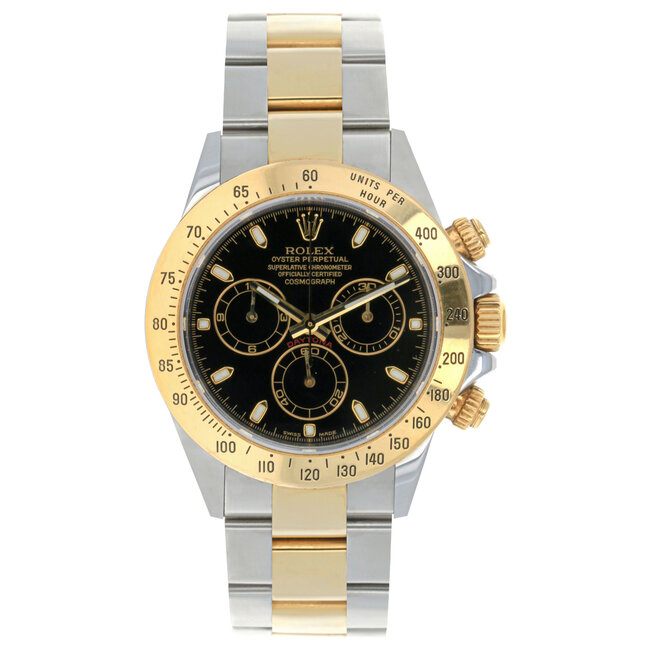 40mm Yellow Rolesor case with 904L steel monobloc middle case, screw-down steel back, screw-down crown and push buttons with Triplock triple waterproofness, fixed 18K yellow gold bezel with engraved tachymetric scale, scratch-resistant sapphire crystal, black dial, index hour markers, Rolex calibre 4130 self-winding movement with chronograph central second hand, 30-minute counter at 3 o'clock, and 12-hour counter at 9 o'clock, approximately 72 hours of power reserve, 18K yellow gold Oyster bracelet with flat three-piece links made from a combination of 904L steel and 18K yellow gold, folding Oysterlock buckle with Easylink 5mm comfort extension link. Waterproof to 100 meters.