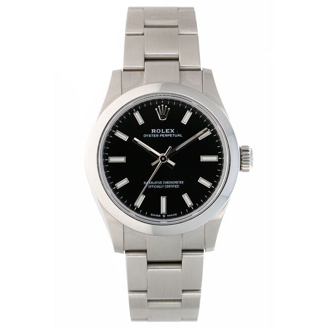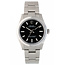 Oystersteel case, screw-down crown with twinlock double waterproofness system, domed bezel, scratch-resistant sapphire crystal, bright black dial, index hour markers, Rolex calibre 2232 automatic movement with center hour, minute and seconds hands, and stop-seconds for precise time setting, approximately 55 hours of power reserve, Oyster bracelet with flat three-piece links, folding Oysterclasp buckle with Easylink 5mm comfort extension link. Waterproof to 100 meters.