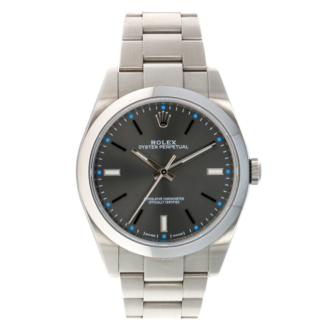 39mm stainless steel case, screw-down back, screw-down crown with twinlock double waterproofness system, domed bezel, scratch-resistant sapphire crystal, dark rhodium dial, index hour markers, Rolex calibre 3132 automatic movement with center hour, minute and seconds hands, stop-seconds for precise time setting, stainless steel Oyster bracelet with flat three-piece links, folding Oysterclasp buckle. Waterproof to 100 meters.