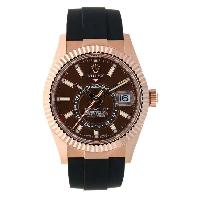 42mm 18K Everose gold case, screw-down back, screw-down crown with twinlock double waterproofness system, fluted bezel, scratch-resistant sapphire crystal with cyclops lens over the date, chocolate dial, index hour markers, Rolex calibre 9001 automatic mo Read more.
