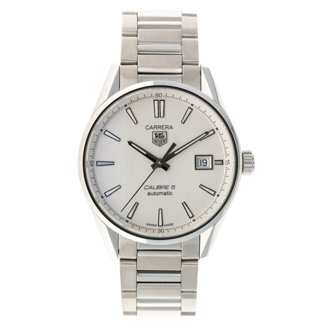 Classic TAG Heuer Carrera with a 39mm stainless-steel case and a silver dial. The bracelet is fine-brushed and polished steel. Read more.