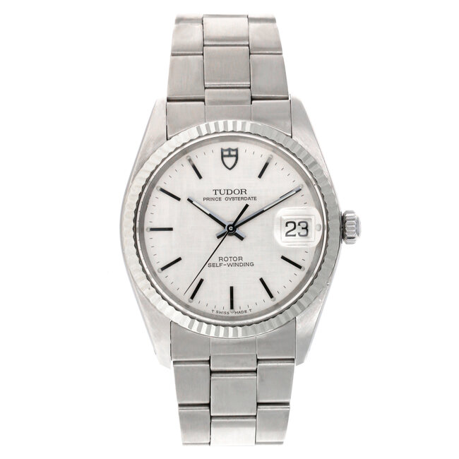 VINTAGE TUDOR PRINCE OYSTER DATE 36MM. FLUTED BEZEL ON WHITE DIAL W/ DATE WINDOW. STEEL BRACELET WITH DEPLOYMENT CLASP. ROLEX SIGNED CROWN AND CASE BACK. Read more.