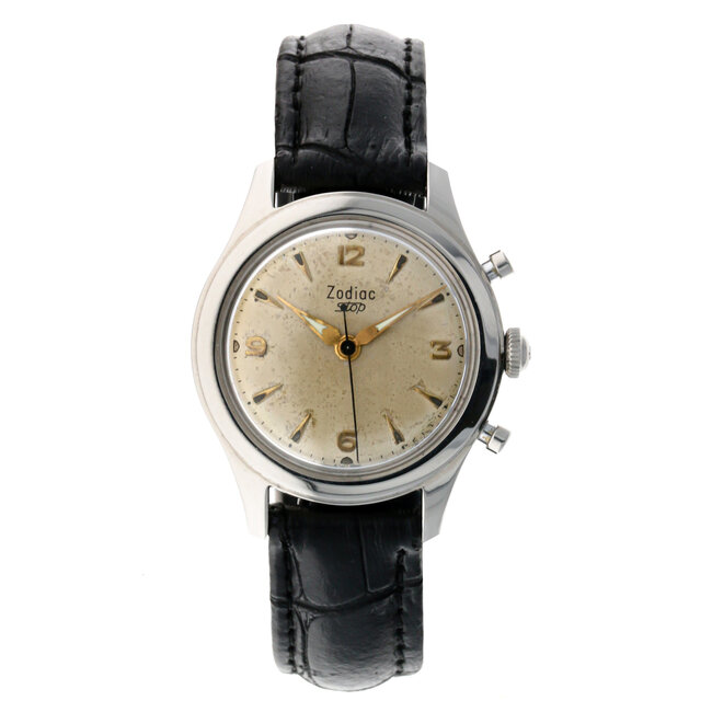 VINTAGE CIRCA 1950'S ZODIAC "STOP" WRISTWATCH. 32MM STAINLESS STEEL CASE. CHAMPAGNE DIAL WITH 12, 3, 6 ,9 ARABIC HOUR MARKERS. LEATHER BAND. Read more.